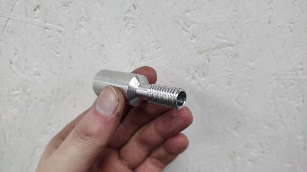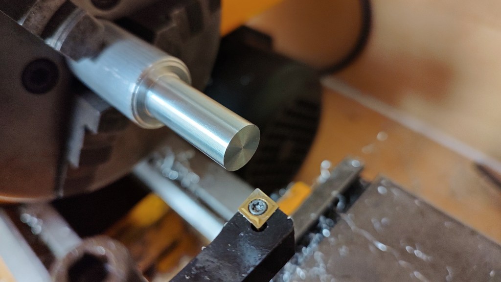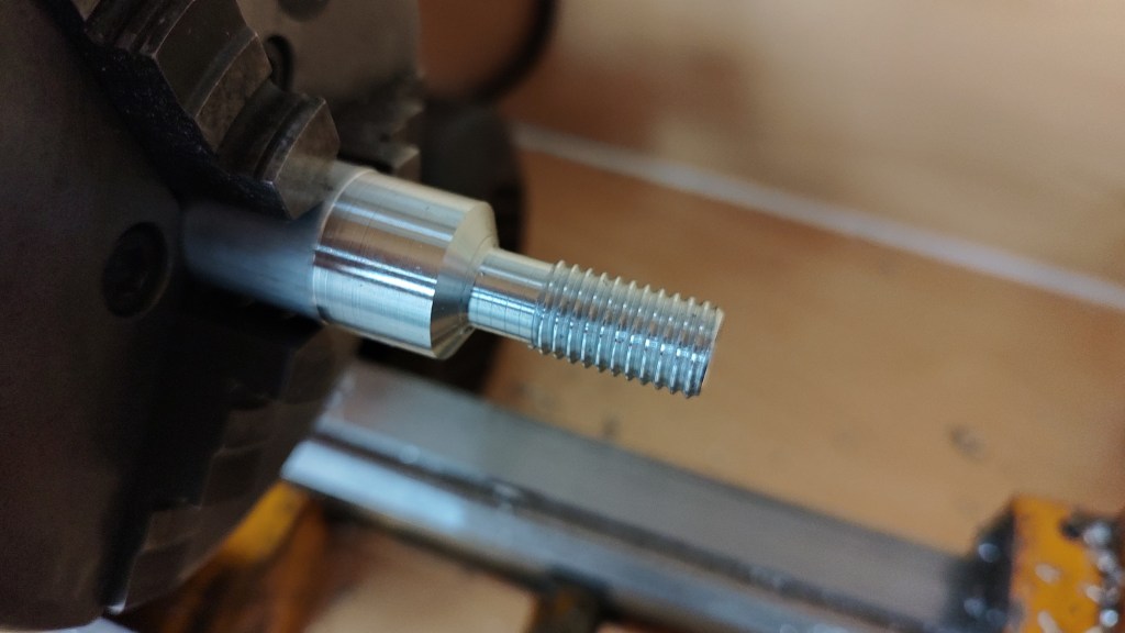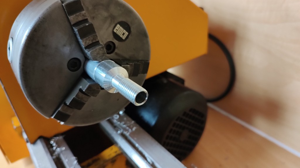 Lathe project 2: Pull tube to close collets, machined from round stock and tube (work in progress).